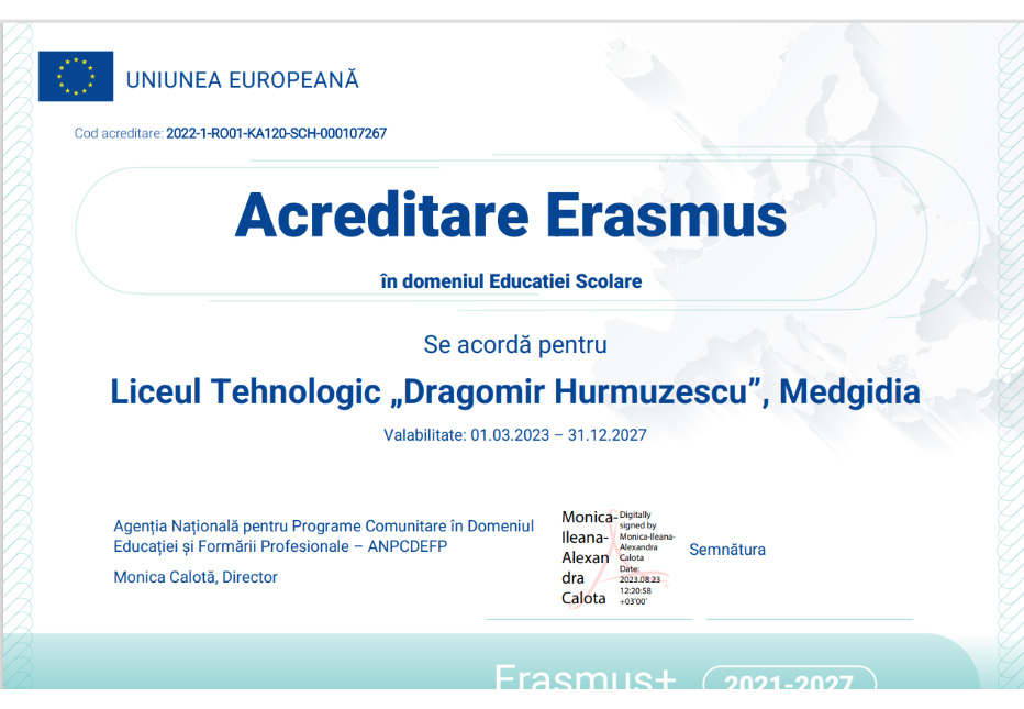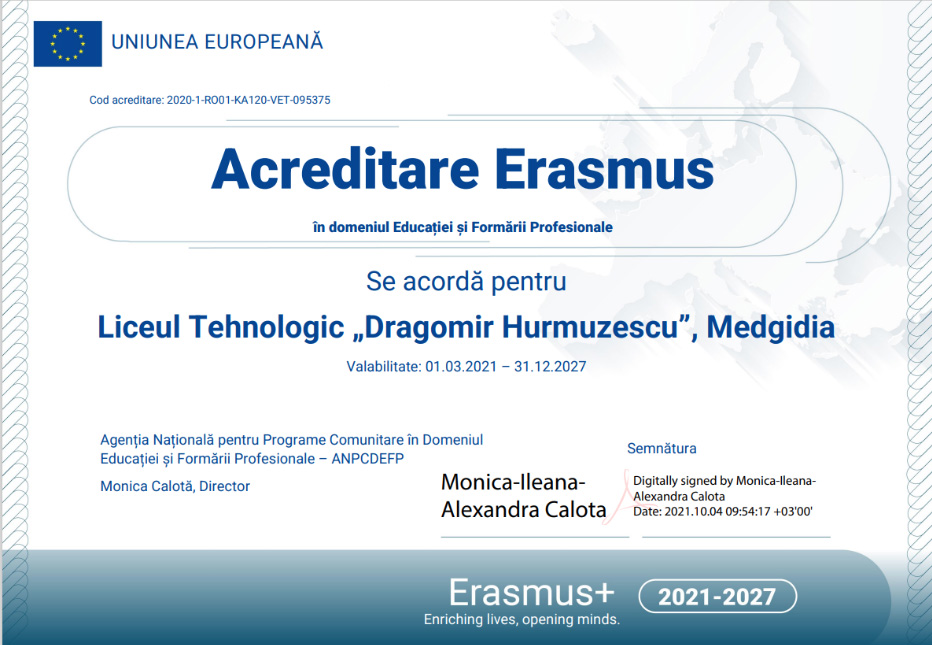 În anul școlar 2022 – 2023 școala a obținut acreditarea în domeniul Educației școlare astfel că din anul 2023 până în anul 2027 elevii și profesorii vor participa la activități de formare și educative în unitați școlare și de formare din țări ale Uniunii Europene.